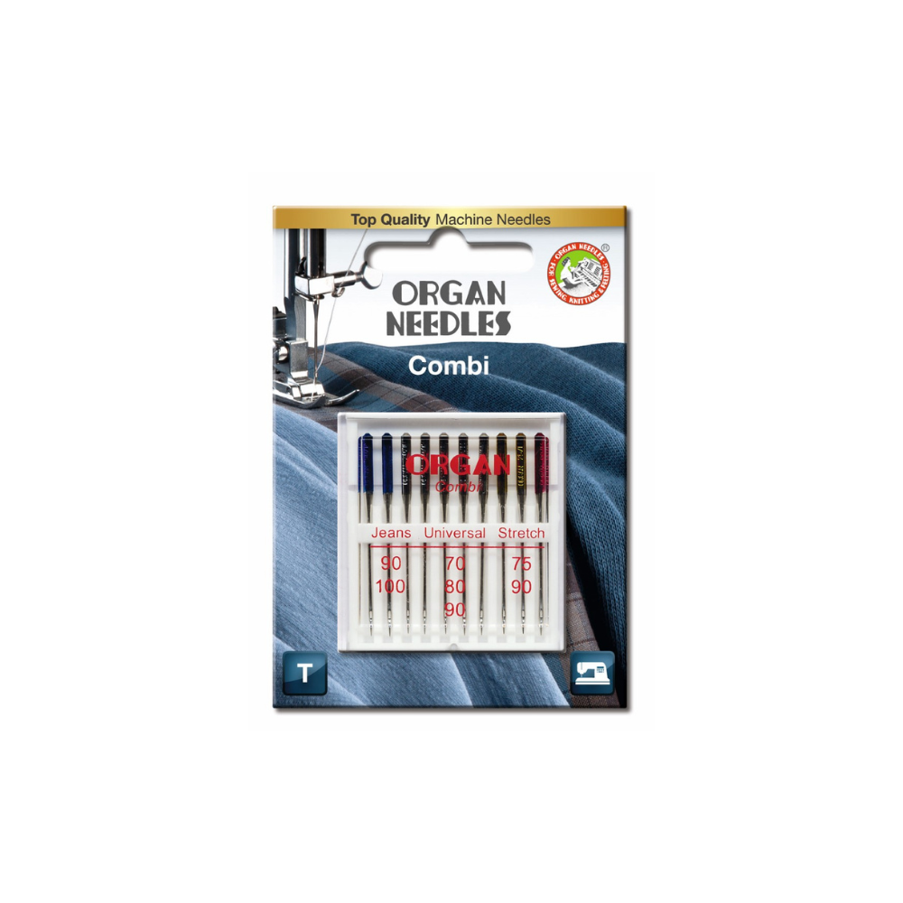 O blister sortido Organ oferece agulhas Universal, Jeans e Stretch, atendendo desde tecidos leves até pesados e materiais elásticos.